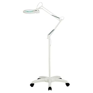 Get up near your work with this magnifying lamp with rolling floor stand. The lens incorporates a magnification of 3x. White end. Includes one twenty two watt circular daylight bulb. 34" wide. 61" high.
